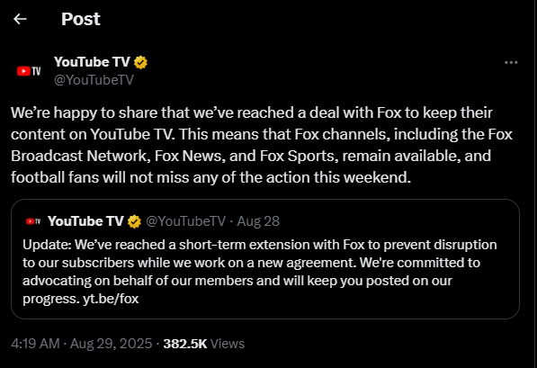The deal comes after tense negotiations between YouTube TV’s parent company and Fox, following the expiration of their previous contract on August 27. Without an agreement, popular channels such as Fox Sports 1, Fox Business, and Fox News would have gone dark for subscribers. A last-minute extension was announced just before the deadline, giving the parties more time to finalize terms.